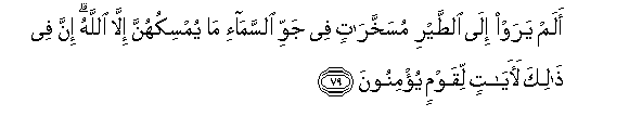 79. Alam yaraw ila alttayri musakhkharatin fee jawwi alssama-i ma yumsikuhunna illa Allahu inna fee thalika laayatin liqawmin yu/minoona