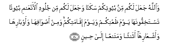 80. WaAllahu jaAAala lakum min buyootikum sakanan wajaAAala lakum min juloodi al-anAAami buyootan tastakhiffoonaha yawma thaAAnikum wayawma iqamatikum wamin aswafiha waawbariha waashAAariha athathan wamataAAan ila heenin