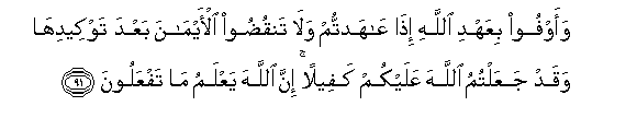 91. Waawfoo biAAahdi Allahi itha AAahadtum wala tanqudoo al-aymana baAAda tawkeediha waqad jaAAaltumu Allaha AAalaykum kafeelan inna Allaha yaAAlamu ma tafAAaloona