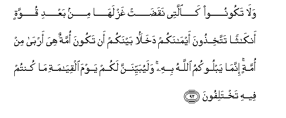 92. Wala takoonoo kaallatee naqadat ghazlaha min baAAdi quwwatin ankathan tattakhithoona aymanakum dakhalan baynakum an takoona ommatun hiya arba min ommatin innama yablookumu Allahu bihi walayubayyinanna lakum yawma alqiyamati ma kuntum feehi takhtalifoona