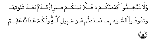 94. Wala tattakhithoo aymanakum dakhalan baynakum fatazilla qadamun baAAda thubootiha watathooqoo alssoo-a bima sadadtum AAan sabeeli Allahi walakum AAathabun AAatheemun