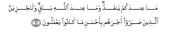 96. Ma AAindakum yanfadu wama AAinda Allahi baqin walanajziyanna allatheena sabaroo ajrahum bi-ahsani ma kanoo yaAAmaloona