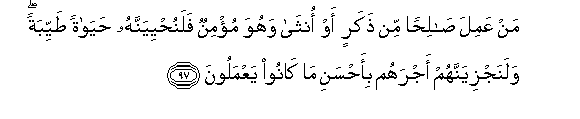 97. Man AAamila salihan min thakarin aw ontha wahuwa mu/minun falanuhyiyannahu hayatan tayyibatan walanajziyannahum ajrahum bi-ahsani ma kanoo yaAAmaloona