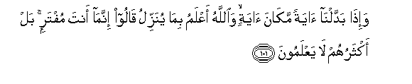 101. Wa-itha baddalna ayatan makana ayatin waAllahu aAAlamu bima yunazzilu qaloo innama anta muftarin bal aktharuhum la yaAAlamoona