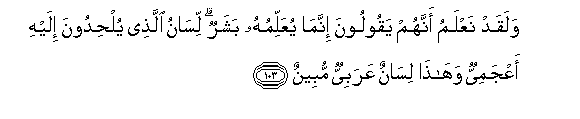 103. Walaqad naAAlamu annahum yaqooloona innama yuAAallimuhu basharun lisanu allathee yulhidoona ilayhi aAAjamiyyun wahatha lisanun AAarabiyyun mubeenun
