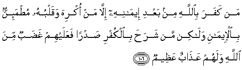 106. Man kafara biAllahi min baAAdi eemanihi illa man okriha waqalbuhu mutma-innun bial-eemani walakin man sharaha bialkufri sadran faAAalayhim ghadabun mina Allahi walahum AAathabun AAatheemun