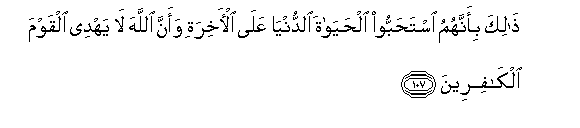 107. Thalika bi-annahumu istahabboo alhayata alddunya AAala al-akhirati waanna Allaha la yahdee alqawma alkafireena
