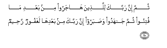 110. Thumma inna rabbaka lillatheena hajaroo min baAAdi ma futinoo thumma jahadoo wasabaroo inna rabbaka min baAAdiha laghafoorun raheemun