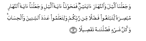 12. WajaAAalna allayla waalnnahara ayatayni famahawna ayata allayli wajaAAalna ayata alnnahari mubsiratan litabtaghoo fadlan min rabbikum walitaAAlamoo AAadada alssineena waalhisaba wakulla shay-in fassalnahu tafseelan