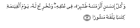 13. Wakulla insanin alzamnahu ta-irahu fee AAunuqihi wanukhriju lahu yawma alqiyamati kitaban yalqahu manshooran