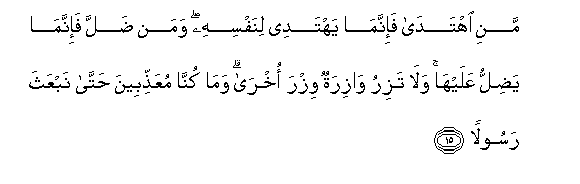 15. Mani ihtada fa-innama yahtadee linafsihi waman dalla fa-innama yadillu AAalayha wala taziru waziratun wizra okhra wama kunna muAAaththibeena hatta nabAAatha rasoolan