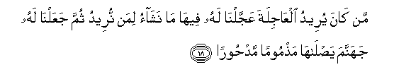 18. Man kana yureedu alAAajilata AAajjalna lahu feeha ma nashao liman nureedu thumma jaAAalna lahu jahannama yaslaha mathmooman madhooran