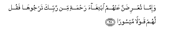 28. Wa-imma tuAAridanna AAanhumu ibtighaa rahmatin min rabbika tarjooha faqul lahum qawlan maysooran
