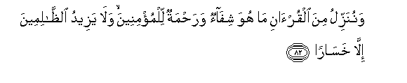 82. Wanunazzilu mina alqur-ani ma huwa shifaon warahmatun lilmu/mineena wala yazeedu alththalimeena illa khasaran