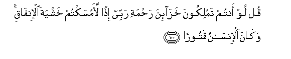 100. Qul law antum tamlikoona khaza-ina rahmati rabbee ithan laamsaktum khashyata al-infaqi wakana al-insanu qatooran