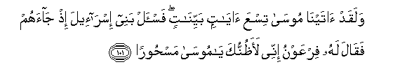 101. Walaqad atayna moosa tisAAa ayatin bayyinatin fais-al banee isra-eela ith jaahum faqala lahu firAAawnu innee laathunnuka ya moosa mashooran