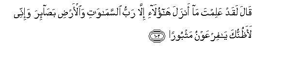 102. Qala laqad AAalimta ma anzala haola-i illa rabbu alssamawati waal-ardi basa-ira wa-innee laathunnuka ya firAAawnu mathbooran