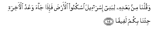 104. Waqulna min baAAdihi libanee isra-eela oskunoo al-arda fa-itha jaa waAAdu al-akhirati ji/na bikum lafeefan