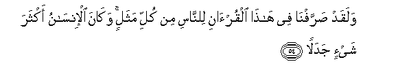 54. Walaqad sarrafna fee hatha alqur-ani lilnnasi min kulli mathalin wakana al-insanu akthara shay-in jadalan