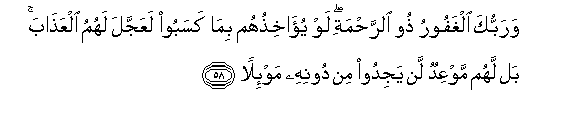 58. Warabbuka alghafooru thoo alrrahmati law yu-akhithuhum bima kasaboo laAAajjala lahumu alAAathaba bal lahum mawAAidun lan yajidoo min doonihi maw-ilan