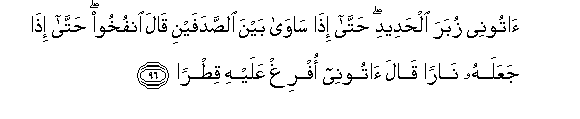 96. Atoonee zubara alhadeedi hatta itha sawa bayna alsadafayni qala onfukhoo hatta itha jaAAalahu naran qala atoonee ofrigh AAalayhi qitran