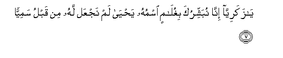 7. Ya zakariyya inna nubashshiruka bighulamin ismuhu yahya lam najAAal lahu min qablu samiyyan