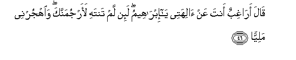 46. Qala araghibun anta AAan alihatee ya ibraheemu la-in lam tantahi laarjumannaka waohjurnee maliyyan