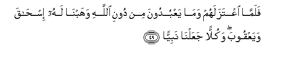 49. Falamma iAAtazalahum wama yaAAbudoona min dooni Allahi wahabna lahu ishaqa wayaAAqooba wakullan jaAAalna nabiyyan