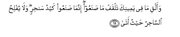 69. Waalqi ma fee yameenika talqaf ma sanaAAoo innama sanaAAoo kaydu sahirin wala yuflihu alssahiru haythu ata