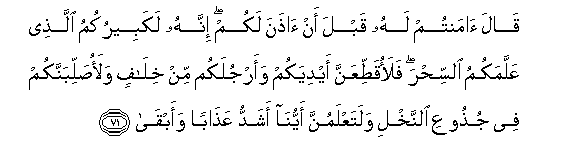 71. Qala amantum lahu qabla an athana lakum innahu lakabeerukumu allathee AAallamakumu alssihra falaoqattiAAanna aydiyakum waarjulakum min khilafin walaosallibannakum fee juthooAAi alnnakhli walataAAlamunna ayyuna ashaddu AAathaban waabqa