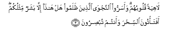 3. Lahiyatan quloobuhum waasarroo alnnajwa allatheena thalamoo hal hatha illa basharun mithlukum afata/toona alssihra waantum tubsiroona