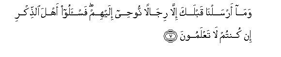 7. Wama arsalna qablaka illa rijalan noohee ilayhim fais-aloo ahla alththikri in kuntum la taAAlamoona