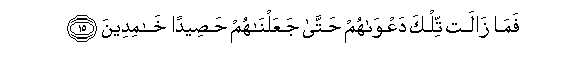 15. Fama zalat tilka daAAwahum hatta jaAAalnahum haseedan khamideena