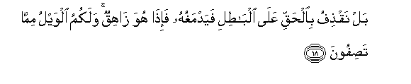 18. Bal naqthifu bialhaqqi AAala albatili fayadmaghuhu fa-itha huwa zahiqun walakumu alwaylu mimma tasifoona