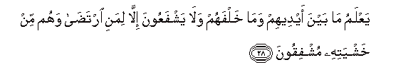 28. YaAAlamu ma bayna aydeehim wama khalfahum wala yashfaAAoona illa limani irtada wahum min khashyatihi mushfiqoona