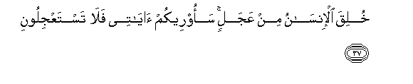 37. Khuliqa al-insanu min AAajalin saoreekum ayatee fala tastaAAjiloona