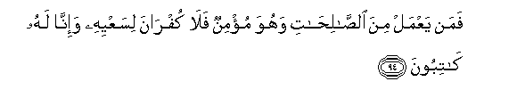 94. Faman yaAAmal mina alssalihati wahuwa mu/minun fala kufrana lisaAAyihi wa-inna lahu katiboona