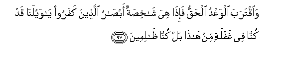 97. Waiqtaraba alwaAAdu alhaqqu fa-itha hiya shakhisatun absaru allatheena kafaroo ya waylana qad kunna fee ghaflatin min hatha bal kunna thalimeena