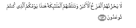 103. La yahzunuhumu alfazaAAu al-akbaru watatalaqqahumu almala-ikatu hatha yawmukumu allathee kuntum tooAAadoona
