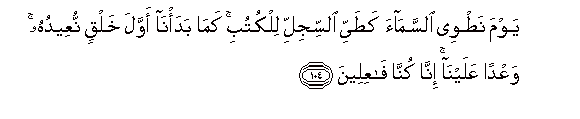 104. Yawma natwee alssamaa katayyi alssijlli lilkutubi kama bada/na awwala khalqin nuAAeeduhu waAAdan AAalayna inna kunna faAAileena