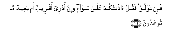 109. Fa-in tawallaw faqul athantukum AAala sawa-in wa-in adree aqareebun am baAAeedun ma tooAAadoona
