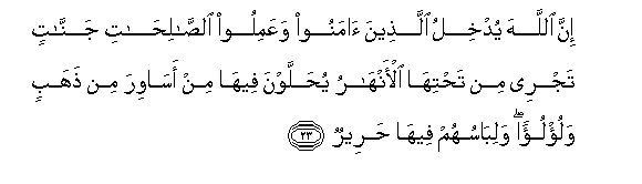 23. Inna Allaha yudkhilu allatheena amanoo waAAamiloo alssalihati jannatin tajree min tahtiha al-anharu yuhallawna feeha min asawira min thahabin walu/lu-an walibasuhum feeha hareerun