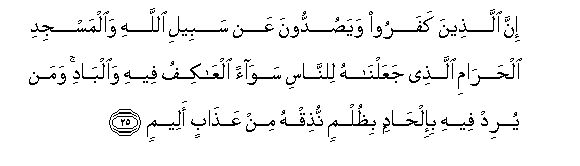25. Inna allatheena kafaroo wayasuddoona AAan sabeeli Allahi waalmasjidi alharami allathee jaAAalnahu lilnnasi sawaan alAAakifu feehi waalbadi waman yurid feehi bi-ilhadin bithulmin nuthiqhu min AAathabin aleemin