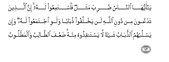 73. Ya ayyuha alnnasu duriba mathalun faistamiAAoo lahu inna allatheena tadAAoona min dooni Allahi lan yakhluqoo thubaban walawi ijtamaAAoo lahu wa-in yaslubuhumu alththubabu shay-an la yastanqithoohu minhu daAAufa alttalibu waalmatloobu