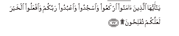 77. Ya ayyuha allatheena amanoo irkaAAoo waosjudoo waoAAbudoo rabbakum waifAAaloo alkhayra laAAallakum tuflihoona