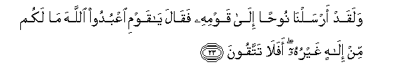 23. Walaqad arsalna noohan ila qawmihi faqala ya qawmi oAAbudoo Allaha ma lakum min ilahin ghayruhu afala tattaqoona