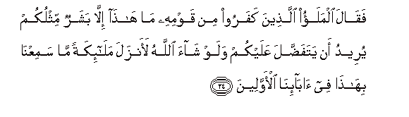 24. Faqala almalao allatheena kafaroo min qawmihi ma hatha illa basharun mithlukum yureedu an yatafaddala AAalaykum walaw shaa Allahu laanzala mala-ikatan ma samiAAna bihatha fee aba-ina al-awwaleena