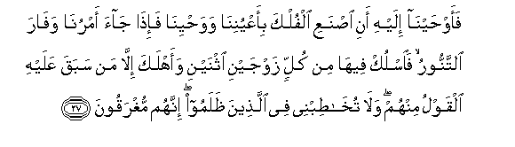 27. Faawhayna ilayhi ani isnaAAi alfulka bi-aAAyunina wawahyina fa-itha jaa amruna wafara alttannooru faosluk feeha min kullin zawjayni ithnayni waahlaka illa man sabaqa AAalayhi alqawlu minhum wala tukhatibnee fee allatheena thalamoo innahum mughraqoona