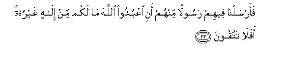 32. Faarsalna feehim rasoolan minhum ani oAAbudoo Allaha ma lakum min ilahin ghayruhu afala tattaqoona