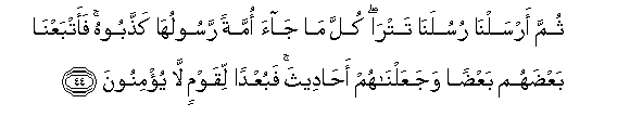 44. Thumma arsalna rusulana tatra kulla ma jaa ommatan rasooluha kaththaboohu faatbaAAna baAAdahum baAAdan wajaAAalnahum ahadeetha fabuAAdan liqawmin la yu/minoona